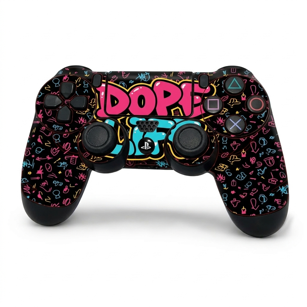 Profesjonalna naklejka personalizująca, stworzona dla użytkowników ceniących unikalny design oraz skuteczną ochronę akcesoriów gamingowych. Wzór wyróżnia się centralnie umieszczonym, wyrazistym napisem „DOPE LIFE” w stylu bąbelkowego graffiti, skontrastowanym z czarnym tłem pokrytym drobnymi, kolorowymi tagami i symbolami, co nadaje kontrolerowi DualShock 4 nowoczesny, streetartowy charakter.