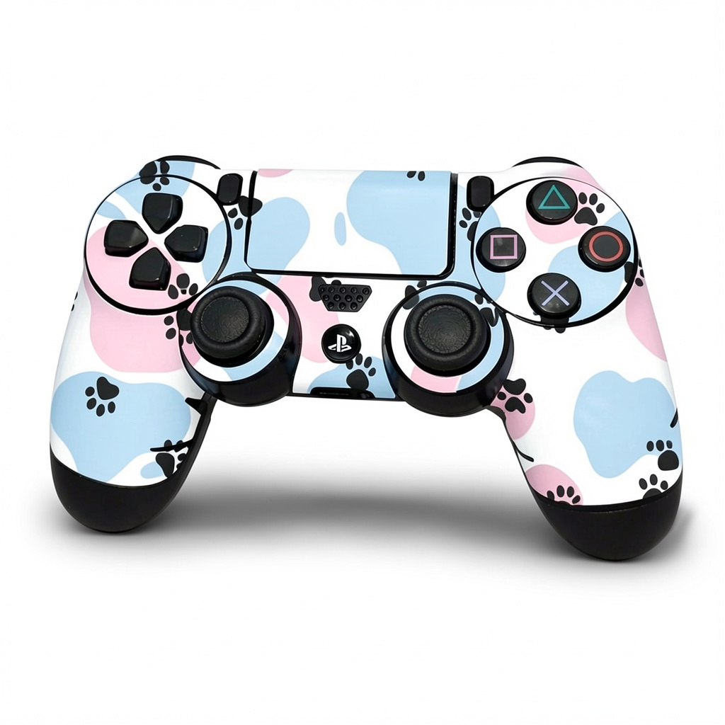 Profesjonalna naklejka personalizująca, stworzona dla użytkowników ceniących unikalny design oraz skuteczną ochronę akcesoriów gamingowych. Wzór bazuje na harmonijnym połączeniu błękitnych i różowych plam, na które naniesiono wyrazisty motyw czarnych, zwierzęcych łapek, co nadaje kontrolerowi DualShock 4 nowoczesny, estetyczny i bardzo sympatyczny wygląd.